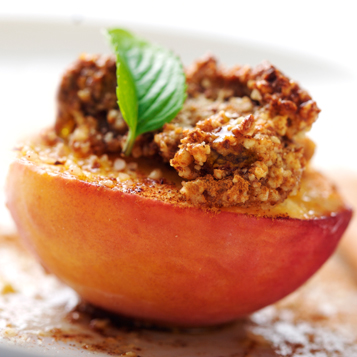 A warm and cozy treat, these tender baked peaches are elevated with a crunchy oat topping.